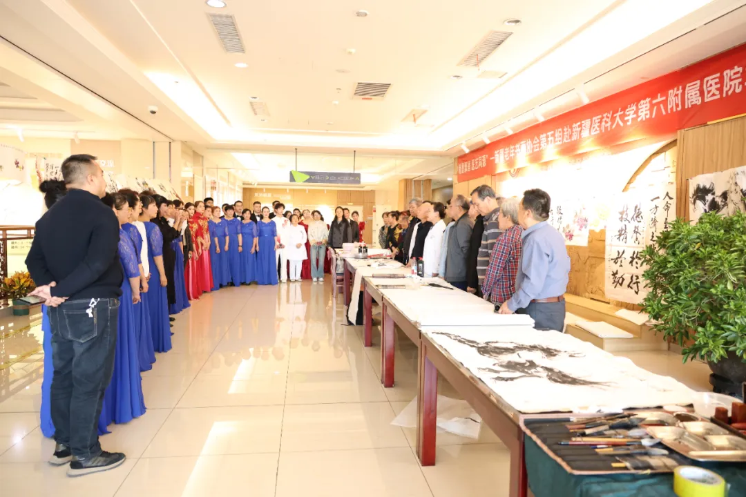 砥砺奋进七十载,天山南北绽新颜。为庆祝新疆维吾尔自治区成立七十周年,10月11日,新疆医科大学第六附属医院门诊外科楼五楼大厅墨香浮动,一场以“翰墨飘香 医艺同源”为主题的书画笔会在此启幕。新疆老年书画协会第五组的书画家们应邀而来,以笔为桥,将医学人文与艺术之美悄然串联。