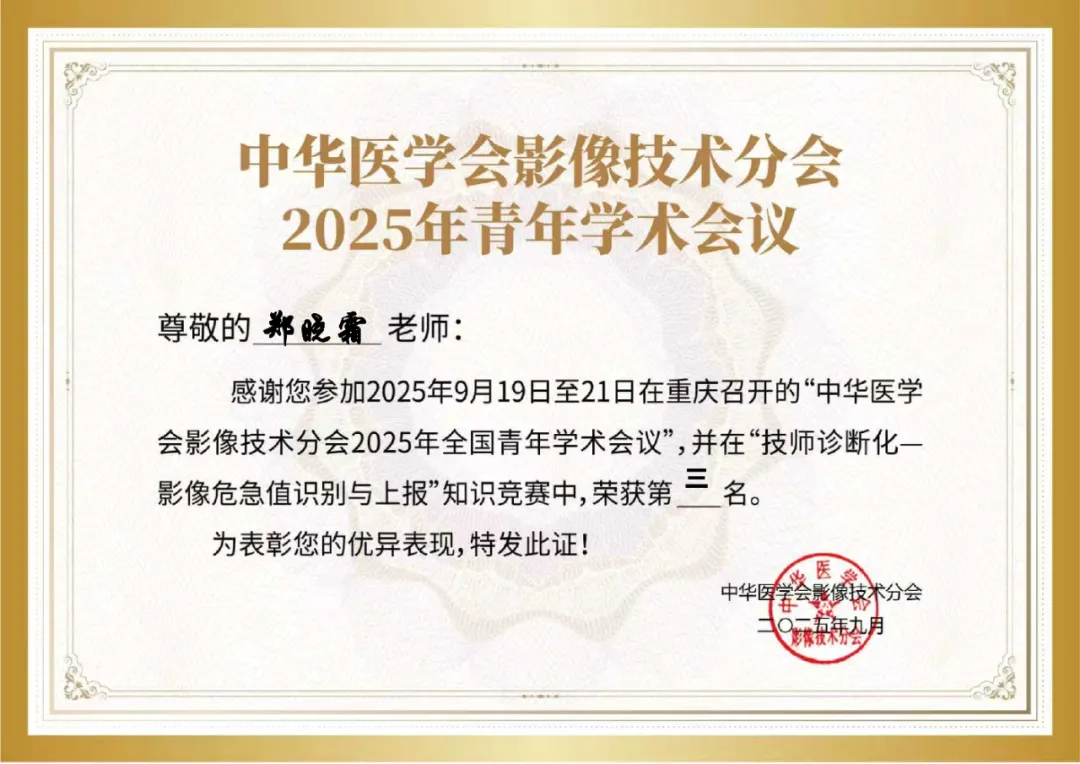 近日,从中华医学会影像技术分会2025年全国青年学术会议传来捷报——新疆医科大学第六附属医院放射影像科青年技师郑晓霜,在全国多地选手同台竞技的“技师诊断化—影像危急值识别与上报”知识竞赛中脱颖而出,凭借过硬专业能力斩获第三名,为医院赢得荣誉。
