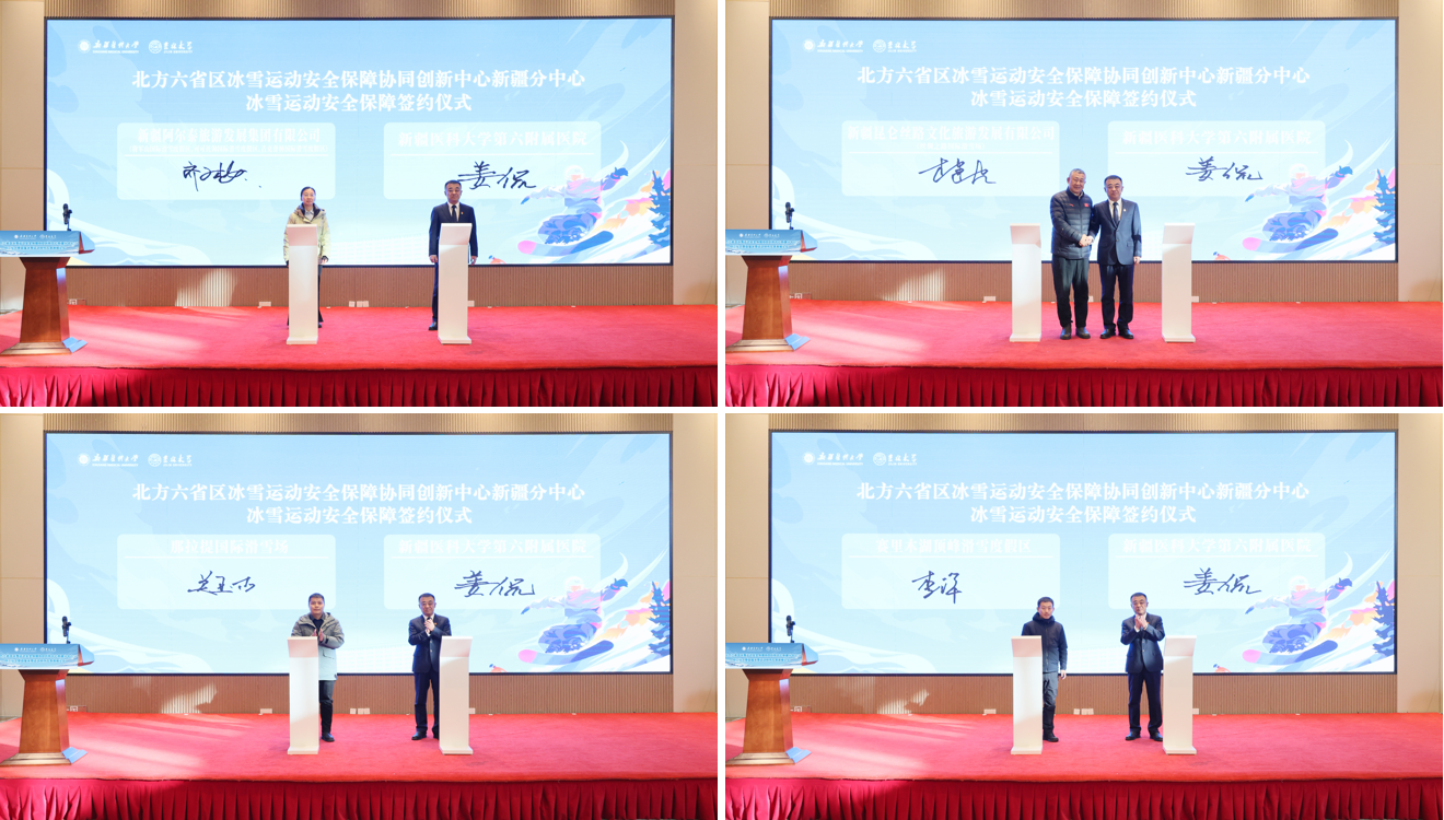 合作协议签约环节,新疆医科大学第六附属医院院长姜侃与吉克普林、可可托海、将军山国际滑雪度假区,新疆丝绸之路山地度假区、那拉提国际滑雪场、赛里木湖顶峰滑雪度假区六大滑雪场代表签署合作协议,标志着新疆冰雪运动安全保障协同网络正式建成。