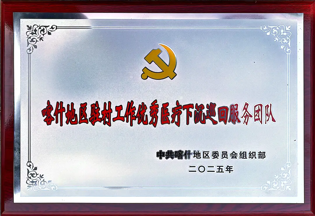 近日,我院派驻喀什地区的医疗下沉巡回服务团队凭借扎实的专业能力、务实的服务作风和突出的工作成效,荣获“喀什地区驻村工作优秀医疗下沉巡回服务团队”称号,这是对我院医疗下沉工作的充分肯定,也是基层群众对团队服务的高度赞誉。