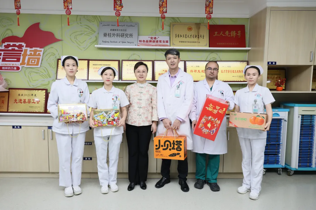 2月16日,农历除夕,节日氛围浓厚。带着学校党委的关心关爱,新疆医科大学党委常委、副校长木胡牙提·乌拉斯汉,纪委副书记刘冠军、资产处副处长陈勤一行莅临我院,看望慰问春节期间坚守岗位的一线医务人员。